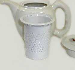 左画像 磁器でできたストレーナー(ポット本体も磁器) これにより電磁レンジ対応となりました。 |