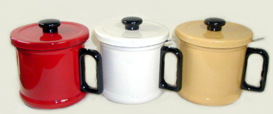 | --------------------------------------------------------------------------- ホーローオイルポット 容量:1.5L サイズ: 本体径φ140×H175mm 取っ手を含めた外幅 200mm 材質: 本体フタ/ほうろう用鋼板ほうろう加工 こしアミ/18-8ステンレス わく/18-0ステンレス 持ち手 フタツマミ/フェノール樹脂 色: レッド ホワイト イエロー 付属: 活性炭カートリッジが1ヶのみ付属で付きます。 (もちろん活性炭をご使用ならなくても結構です。) |