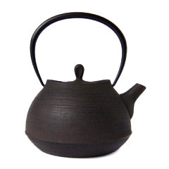 壱鋳堂の鉄瓶・・・「刷毛目」 「雫」 左画像 「鉄瓶 刷毛目」 親しみやすいオーソドックスな形状、伝統的な鉄瓶の印象を受けますが、どこか今までの鉄瓶にない佇(たたず)まいがあります。それは蓋の周囲が立ち上がっているからです。それも左右と前後の高さが違っています。これにより鉄瓶に豊かな膨らみを加味させ、立体感を与えているように思います。これはいままでの鉄瓶にない個性的なフォルムです。独特な味わいがあります。 この鉄瓶の表面仕上げは伝統的な「天然漆焼付け」になっています。黒色の上に、鉄さびとお茶を混ぜたものを上色として塗っています。(おはぐろと呼ばれる技法です)そのため、全体に黒を基調とした中に茶系が混じった色合いとなっています。形状と茶系を含んだ色合いが見事にマッチしています。 |