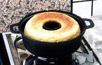 肉厚の南部鉄器の高い蓄熱性が、均一の熱、柔らかい熱を食材に伝えます。そしてさらには、中央の煙突のような構造が、熱の伝わる表面積を広げ、よりまんべんなく熱を伝えます。それにより家庭のガスレンジでふっくらとドーナッツ状の本格的なパンが焼けます。ガスレンジでできるのも、肉厚鉄器の蓄熱性のなせる技です。 |