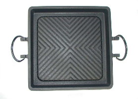 焼肉グリルプレート 角型/南部鉄器 堂々とした肉厚の南部鉄器グリルプレートです。ギザギザプレートが余分な油を落とし、ヘルシーに調理します。また回りには溝が張り巡らされ、油等を集めることができます。またギザギザプレートは、きれいな焦げ目をつけて、美味しさを引き立てます。 グリルプレートの両サイドには、南部鉄器の急須のツルのような持ち手が付いています。これはグリルプレートとしては珍しく、使い勝手も良好です。またデザイン的にも面白く、このプレートの魅力になっています。 南部鉄器のプレートは、フッ素コートのものとは一線を画し、香ばしく焼けた美味しさを提供してくれるものと思っています |
