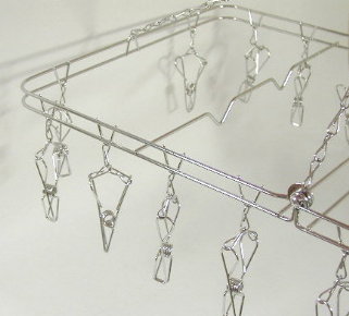 18-8ステンレスを使用することで、太陽の光で劣化することはありませんし、屋外につるしたまま使用しても、長期間美しさが保たれます。 ピンチどうしがからみにくいのでスムーズに開閉できます。またステンレスだから丈夫で、長持ち。 中に支えの線が入っていますが、これには余計な力が入ったときの力の逃げ場になるようV字の加工が施されています。 |