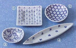 豆小皿 藍 ① 角 ② 丸 ③ 鉢 ④ 葉 生産国:中国 |